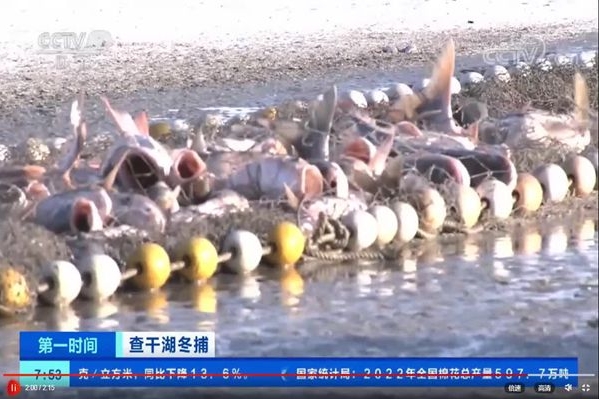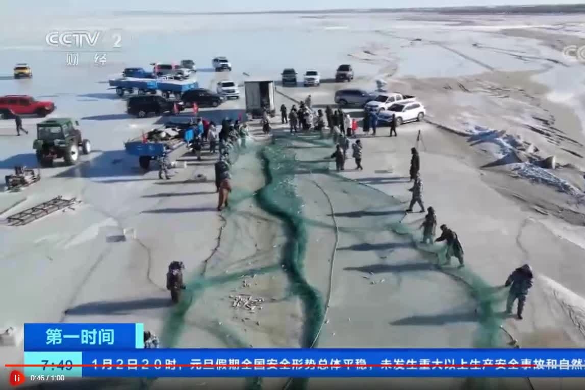 吉林松原:千米大網(wǎng)合圍魚群 冬捕隊(duì)拉網(wǎng)出水