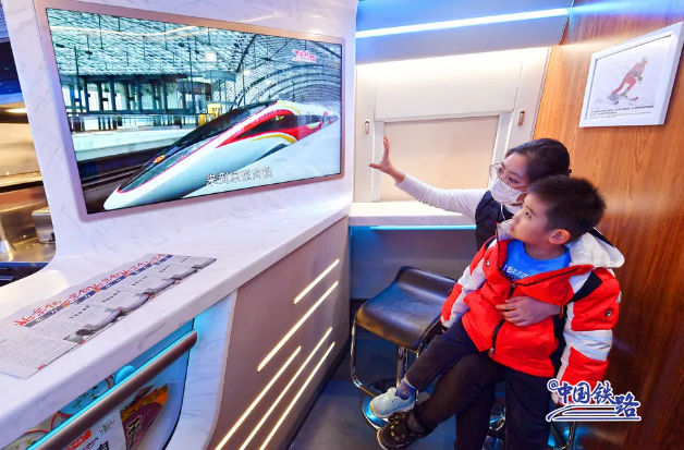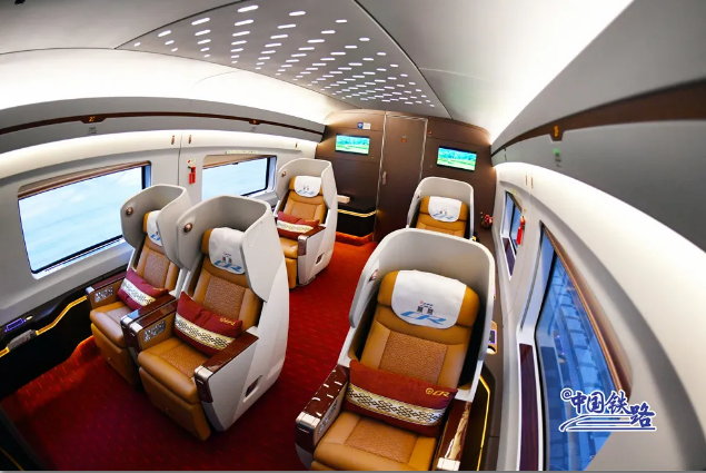 復(fù)興號智能動車組車廂內(nèi)的服務(wù)設(shè)施進(jìn)行了智能化升級,進(jìn)入隧道時,列車可智能控制車內(nèi)壓力,提前調(diào)節(jié)燈光、車窗顏色等。