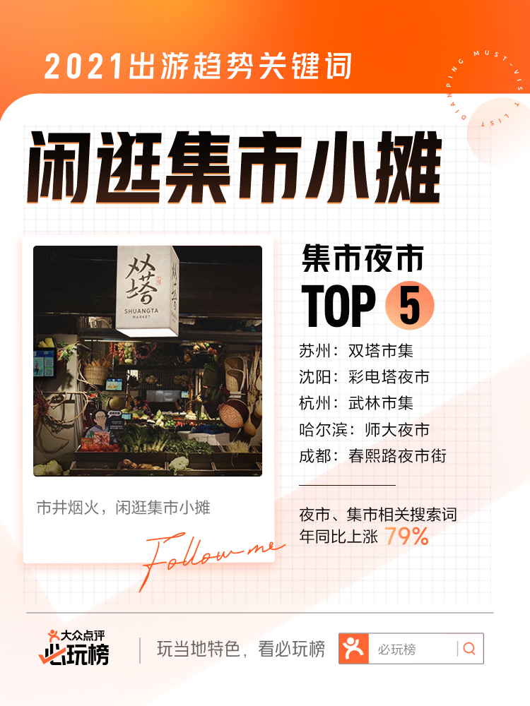 “市井煙火氣,最撫凡人心”,夜市、集市拓寬游客游玩半徑,為深度探索城市提供了更多可能。據(jù)“必玩榜”數(shù)據(jù)顯示,夜市、集市相關(guān)搜索詞年同比上漲79%,其中哈爾濱的師大夜市與蘇州的雙塔市集、沈陽(yáng)的彩電塔夜市、杭州的武林市集、成都的春熙路夜市街共同入選全國(guó)TOP5熱門(mén)集市夜市。