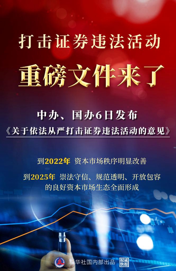 新華社北京7月6日電(記者張千千 劉慧)中共中央辦公廳、國(guó)務(wù)院辦公廳6日公開(kāi)發(fā)布了《關(guān)于依法從嚴(yán)打擊證券違法活動(dòng)的意見(jiàn)》,對(duì)建立健全資本市場(chǎng)執(zhí)法司法體制機(jī)制、依法從嚴(yán)打擊證券違法活動(dòng)、推動(dòng)資本市場(chǎng)高質(zhì)量發(fā)展作出重要部署。
