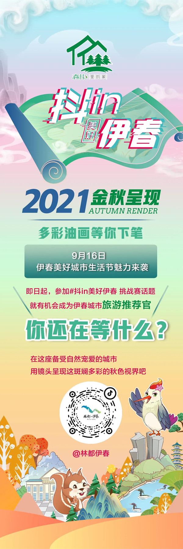 16日,伊春市文化廣電和旅游局、哈爾濱新媒網(wǎng)絡(luò)科技有限公司聯(lián)合策劃發(fā)起抖音挑戰(zhàn)賽 #抖in美好伊春正式上線,來(lái)伊春拍攝五花山色或分享身邊的秋季美景,視頻添加話題并關(guān)注賬號(hào)“林都伊春”即可參與成功。