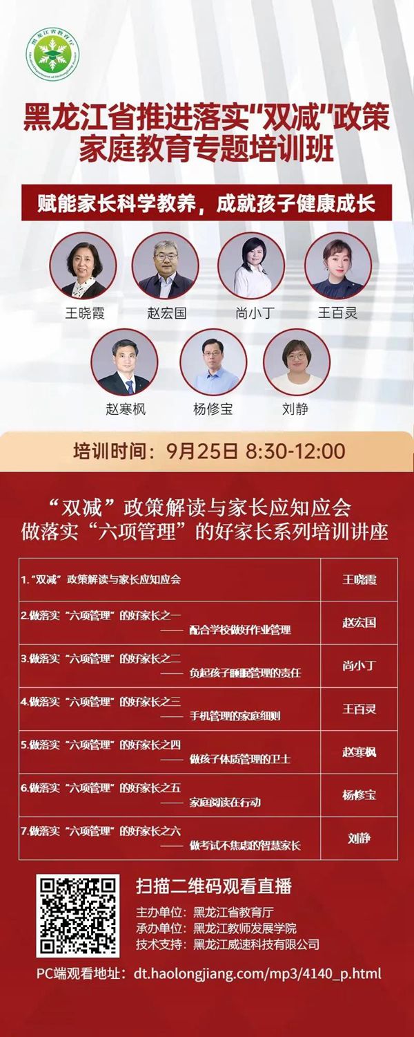 據(jù)了解,此次培訓(xùn)是《黑龍江省中小學(xué)“百萬(wàn)家庭賦能”工程實(shí)施方案》重要組成部分,也是省教育廳踐行黨史學(xué)習(xí)教育“我為群眾辦實(shí)事”,解決群眾急難愁盼問(wèn)題的具體舉措,由省教育廳主辦、黑龍江教師發(fā)展學(xué)院承辦,基礎(chǔ)教育處處長(zhǎng)領(lǐng)銜六位家庭教育專家共同開(kāi)講,時(shí)長(zhǎng)三個(gè)半小時(shí),受到廣大家長(zhǎng)的一致好評(píng),取得良好的社會(huì)反響,直播時(shí)瀏覽峰值達(dá)到210.7萬(wàn)人次。培訓(xùn)內(nèi)容緊緊圍繞廣大家長(zhǎng)們“雙減”形勢(shì)下的困惑,深入宣傳“雙減”政策和年初以來(lái)教育部相繼下發(fā)的關(guān)于手機(jī)、作業(yè)、睡眠、讀物、體質(zhì)、考試等“六項(xiàng)管理”文件內(nèi)容,分七個(gè)專題進(jìn)行深入細(xì)致的家庭教育指導(dǎo),有的放矢地解答家長(zhǎng)“心中所疑”、化解家長(zhǎng)“心中所急”,很多家長(zhǎng)通過(guò)家庭學(xué)校群進(jìn)行交流,有的家長(zhǎng)反饋道:“通過(guò)觀看直播我們家長(zhǎng)深刻體會(huì)到一定要以身作則,在孩子面前少玩手機(jī),多陪孩子閱讀書(shū)籍,多讓孩子進(jìn)行戶外活動(dòng)?!庇械募议L(zhǎng)則表示,聽(tīng)了講座深刻理解了孩子成長(zhǎng)的根基深植于家庭教育的道理,家庭教育才是孩子的起跑線,主動(dòng)地配合學(xué)校落實(shí)“雙減”政策,從做好“六項(xiàng)管理”入手科學(xué)優(yōu)化家庭教養(yǎng)方式,減少孩子的校外培訓(xùn)和作業(yè)負(fù)擔(dān),還給孩子一個(gè)幸福的童年,做一名智慧家長(zhǎng)。
