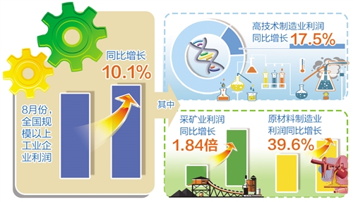從1月份至8月份累計(jì)看,41個(gè)工業(yè)大類行業(yè)中,37個(gè)行業(yè)利潤(rùn)總額同比增長(zhǎng),1個(gè)行業(yè)扭虧為盈,1個(gè)行業(yè)持平,2個(gè)行業(yè)下降。其中,石油、煤炭及其他燃料加工業(yè)利潤(rùn)總額同比增長(zhǎng)24.71倍,石油和天然氣開采業(yè)增長(zhǎng)2.65倍,有色金屬冶煉和壓延加工業(yè)增長(zhǎng)1.78倍,黑色金屬冶煉和壓延加工業(yè)增長(zhǎng)1.56倍,化學(xué)原料和化學(xué)制品制造業(yè)增長(zhǎng)1.45倍,煤炭開采和洗選業(yè)增長(zhǎng)1.45倍。