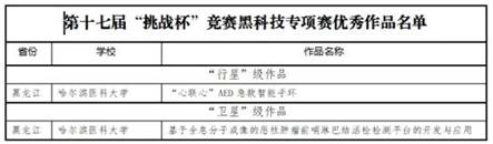 黑龍江經(jīng)濟(jì)網(wǎng)訊(黑龍江日報全媒體見習(xí)記者董廣碩 商祺)近日,第十七屆“挑戰(zhàn)杯”全國大學(xué)生課外學(xué)術(shù)科技作品競賽落下帷幕,哈爾濱醫(yī)科大學(xué)附屬二院團(tuán)隊(duì)《“心聯(lián)心”AED急救智能手環(huán)》和哈醫(yī)大附屬腫瘤醫(yī)院團(tuán)隊(duì)《基于全息分子成像系統(tǒng)的惡性腫瘤前哨淋巴結(jié)活檢檢測平臺的開發(fā)與應(yīng)用》兩個作品在“黑科技”專項(xiàng)賽終審決賽中,分別榮獲“行星級”和“衛(wèi)星級”稱號。