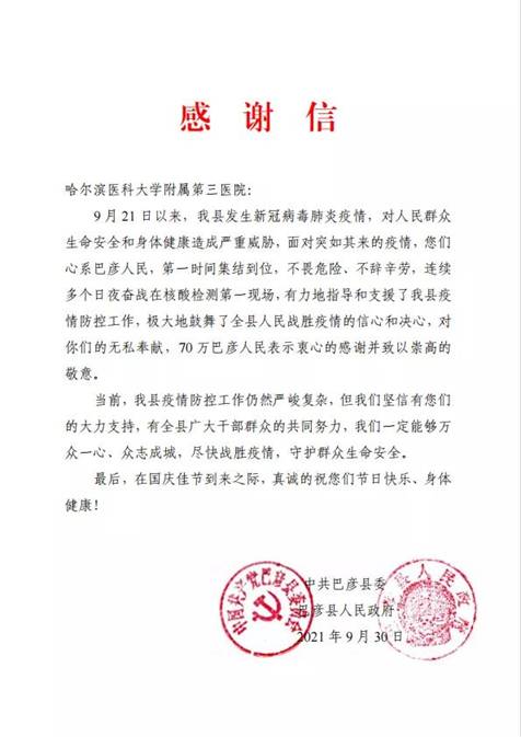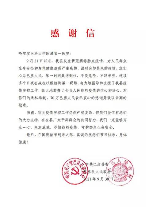 黑龍江經濟網訊(黑龍江日報全媒體見習記者董廣碩 商祺)近日,哈爾濱醫(yī)科大學附屬一院、二院、腫瘤醫(yī)院、四院分別收到巴彥縣委縣政府的感謝信,感謝他們“有力地指導和支援了我縣疫情防控工作,極大地鼓舞了全縣人民戰(zhàn)勝疫情的信心和決心?!?/span>