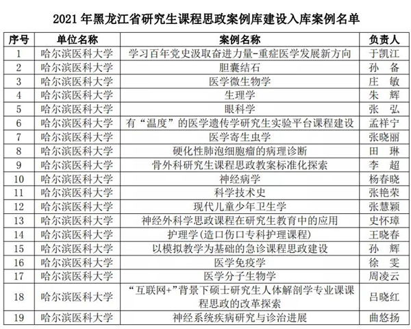 黑龍江經(jīng)濟網(wǎng)訊(黑龍江日報全媒體見習(xí)記者董廣碩 商祺)為貫徹落實國家《關(guān)于全面落實研究生導(dǎo)師立德樹人職責(zé)的意見》《高等學(xué)校課程思政建設(shè)指導(dǎo)綱要》《關(guān)于加快新時代研究生教育改革發(fā)展的意見》精神,按照《關(guān)于加快新時代黑龍江省研究生教育改革發(fā)展的實施意見》要求,日前,經(jīng)全省研究生培養(yǎng)單位遴選推薦,黑龍江省研究生課程思政教育聯(lián)盟專家委員會評審,省學(xué)位委員會、省教育廳批準,哈爾濱醫(yī)科大學(xué)共有26個項目獲批省級立項,其中研究生課程思政課程建設(shè)項目4個、研究生導(dǎo)學(xué)思政團隊(導(dǎo)師)建設(shè)項目2個、研究生課程思政案例19個,慶祝建黨100周年巡展優(yōu)秀研究生導(dǎo)師團隊1支。