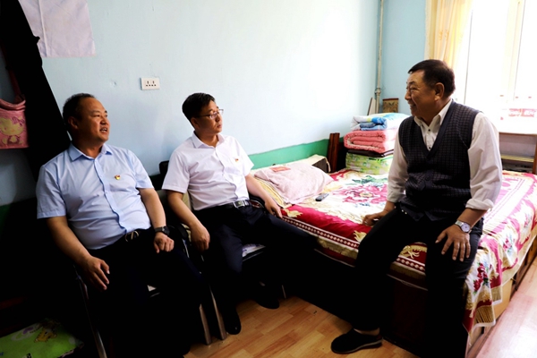 阿木爾林業(yè)局黨委副書記、局長韓鳳泉(中)“七一”走訪慰問退休老干部尹遜言(王力 攝)