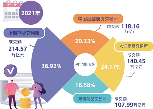 數(shù)據(jù)顯示,上海期貨交易所2021年成交量為24.45億手,成交額為214.57萬億元,同比分別增長(zhǎng)14.9%和40.4%,分別占全國(guó)市場(chǎng)的32.55%和36.92%。