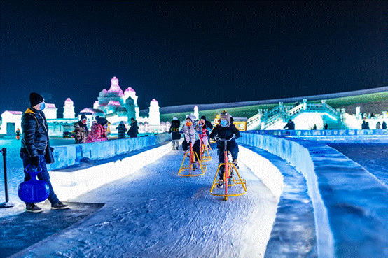 今年園區(qū)的另一個“人氣王”,非單車城堡莫屬。單車城堡內(nèi)的冰上自行車項目,每天都吸引著大量游客騎行體驗。在冰面上掌控方向不是件容易事,騎著冰上自行車,穿行于美麗的冰城堡中,對游客來說是一種前所未有的奇妙體驗。