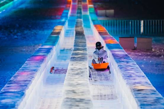 作為哈爾濱冰雪大世界最具人氣的游樂項目,今年的超級冰滑梯滑道長達423米,高低落差達21米,100米滑行速度快過蘇炳添創(chuàng)造的9秒83新亞洲紀錄,游客乘坐大滑梯時也能體驗一把飛人的感覺。