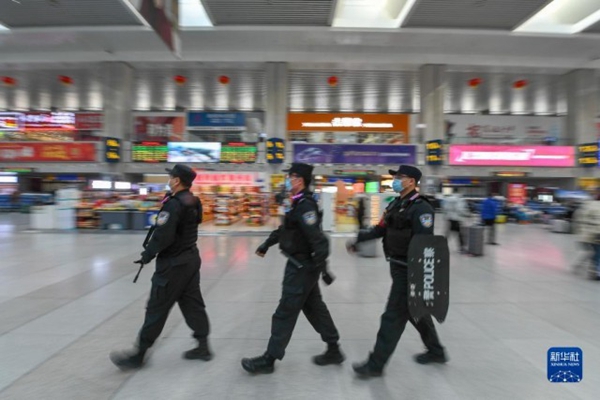 1月20日,在長春火車站候車大廳,馬宇航(后中)與同事一起巡邏。