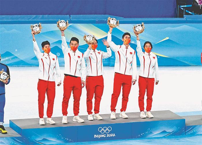 2月5日,中國(guó)隊(duì)選手在頒獎(jiǎng)儀式上。 黑龍江日?qǐng)?bào)全媒體特派記者 郭俊峰攝