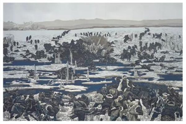 版畫作品《冰趟子戰(zhàn)役中的趙尚志》實景再現(xiàn)了東北抗日聯(lián)軍殲敵最多的著名戰(zhàn)役一一冰趟子戰(zhàn)役,展現(xiàn)了趙尚志同志指揮若定、英勇殲敵的英雄形象。抗聯(lián)戰(zhàn)士借助冰趟子封凍這一東北地區(qū)特有的有利地形,化被動為主動,對尾追日軍進行伏擊,殲滅大量日軍。體現(xiàn)了東北抗聯(lián)在極其惡劣的條件下,捍衛(wèi)中華民族的無畏斗爭精神。