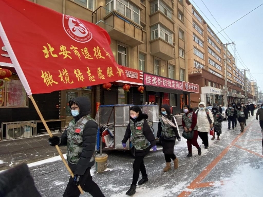 在北安,一走進(jìn)北安步行街,首先映入眼簾的是身著迷彩馬甲的退役軍人志愿者們,向沒佩戴口罩的市民免費發(fā)放口罩,并主動宣傳疫情防控知識;頂著寒風(fēng),將步行街內(nèi)的積雪清理干凈,方便了市民的通行;幫助社區(qū)居民正確分類處置各類生活垃圾。這是北安市退役軍人服務(wù)中心、“橄欖綠”退役軍人志愿者服務(wù)隊正在踐行著幸福北安,文明有我。