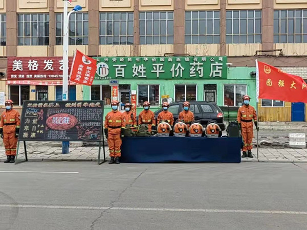 圖強林業(yè)局設立定點宣傳臺,通過展板和森林防滅火裝備向群眾普及森林防火常識(趙明 攝)