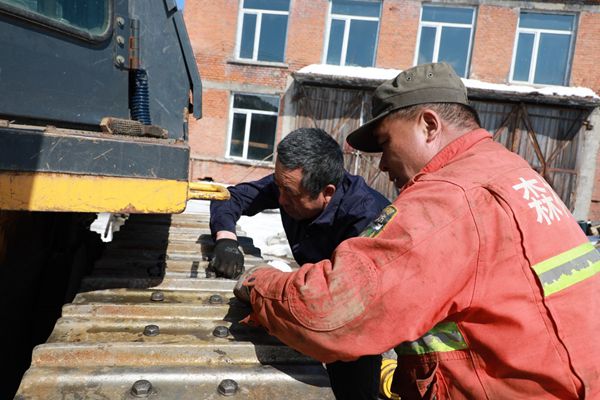阿木爾林業(yè)局多種經(jīng)營公司職工在更換推土機(jī)的鏈軌板(王力 攝)