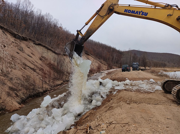 加格達(dá)奇林業(yè)局利用挖掘機(jī)開展破冰作業(yè)(趙子敬 攝)