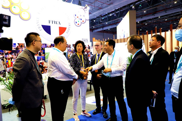 阿木爾林業(yè)局北極冰藍(lán)莓酒莊生產(chǎn)的冰酒、紅酒等產(chǎn)品,在第四屆上海國(guó)際進(jìn)出口博覽會(huì)上展出。大興安嶺林業(yè)集團(tuán)公司黨委副書(shū)記、總經(jīng)理李軍(左五)與國(guó)際友人及林業(yè)局參展人員親切交談,了解酒莊產(chǎn)品特點(diǎn)、市場(chǎng)營(yíng)銷(xiāo)等情況(王力 攝)