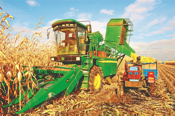 青岡縣機械化收割場景。