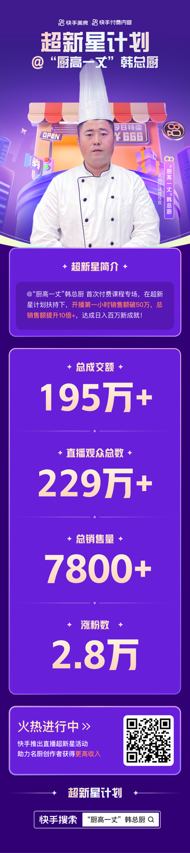 前不久,快手美食主播“廚高一丈韓總廚”(快手ID:hanzhongchu666888)參加了快手官方舉辦的“超新星計(jì)劃”,開(kāi)啟付費(fèi)課程直播專場(chǎng),最終取得總成交額195萬(wàn)+,總銷售量7800+的亮眼成績(jī)。