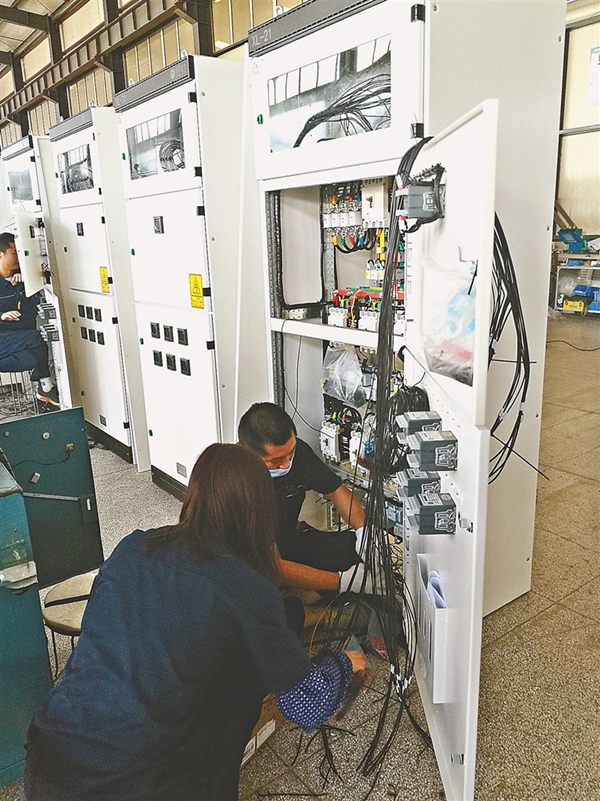 在生產(chǎn)車間,記者看到,工作人員正熟練地組裝配電設備。該公司擁有現(xiàn)代化廠房2.2萬平方米,實現(xiàn)了工業(yè)化和信息化高度融合。