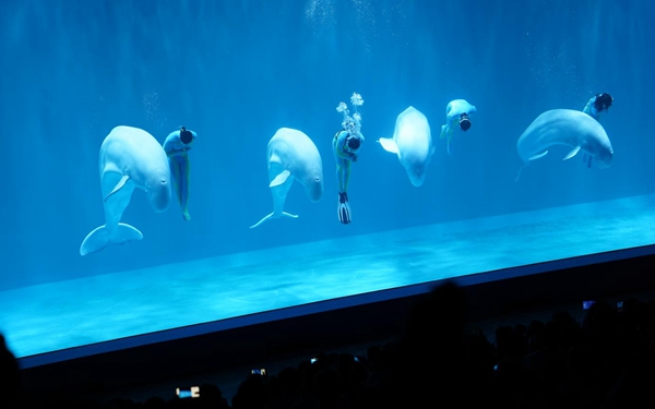 極地公園工作人員介紹,四鯨、四人共同表演難度很大,這樣一場(chǎng)震撼無(wú)比的表演,離不開白鯨寶貝們的高智商和高情商,以及白鯨和馴養(yǎng)師朝夕相處的和諧和默契。這場(chǎng)四鯨秀不僅內(nèi)容新,這四只白鯨也是第一次“組團(tuán)”,它們沒(méi)有任何緊張和怯場(chǎng),超具藝術(shù)家風(fēng)范,最后還不忘集體謝幕,贏得了游客接連不斷的喝彩和掌聲。為了打造世界最好的白鯨表演,哈爾濱極地公園的白鯨劇場(chǎng)從場(chǎng)館設(shè)計(jì)、音樂(lè)編排、燈光音響設(shè)備,到巨型展窗等均做到國(guó)內(nèi)頂級(jí),只為全方位打造世界最好的白鯨秀。
