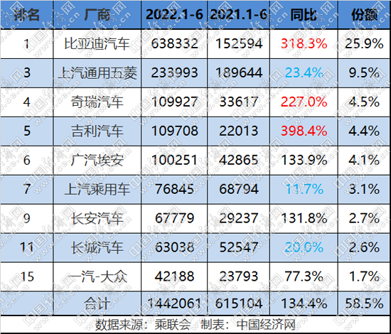 在乘聯(lián)會(huì)發(fā)布的6月新能源乘用車(chē)批發(fā)銷(xiāo)量廠商排名(TOP15)中,傳統(tǒng)品牌占據(jù)10席,共計(jì)銷(xiāo)售33.2萬(wàn)輛,同比增長(zhǎng)158.7%,市場(chǎng)份額接近六成,達(dá)到58.3%,1-6月,傳統(tǒng)品牌新能源累計(jì)銷(xiāo)售144.2萬(wàn)輛,同比增長(zhǎng)134.4%,份額同樣接近六成,為58.5%。