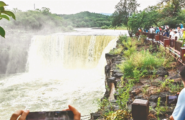 7日,牡丹江市鏡泊湖景區(qū),游客們在吊水樓瀑布觀看跳水表演。