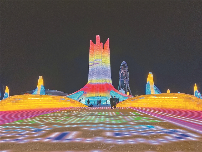“夢(mèng)想大舞臺(tái)”延續(xù)了傳統(tǒng)中式古建筑樣式風(fēng)格,以故宮太和殿為設(shè)計(jì)原型進(jìn)行二次深化設(shè)計(jì),承載舞臺(tái)的功能,古韻十足;“阿拉圖廣場(chǎng)”以吉爾吉斯斯坦的阿拉圖廣場(chǎng)原型設(shè)計(jì)建造,充滿了濃濃的異域風(fēng)格;“勇士廣場(chǎng)”以哈薩克斯坦的潘菲洛夫——28勇士公園為原型設(shè)計(jì);“沙漠之心”以烏茲別克斯坦的雷吉斯坦廣場(chǎng)為原型建造;“自由堡壘”以塔吉克斯坦的苦盞博物館為原型設(shè)計(jì)。景觀“冰雪史冊(cè)”以哈爾濱中央書(shū)店為原型進(jìn)行二次創(chuàng)作,用一幅幅照片、一個(gè)個(gè)精彩瞬間,為游客講述哈爾濱冰雪大世界景區(qū)24年蓬勃發(fā)展的故事,展示哈爾濱厚積60年的冰雪文化與魅力?!敖鹕袊?guó)心”是歷屆最大體量的冰雪互動(dòng)景觀,運(yùn)用聲光互動(dòng)技術(shù),每當(dāng)敲響世紀(jì)鐘,四周的臺(tái)階以及冰面整體的燈光便會(huì)從中心蕩開(kāi),形成流動(dòng)的光影,十分震撼。