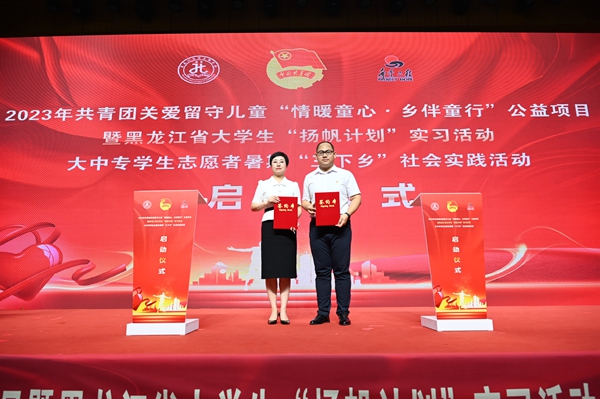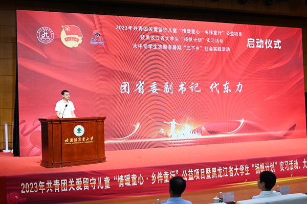 黑龍江經(jīng)濟(jì)網(wǎng)訊(王丹陽 記者祝東)7月5日,2023年共青團(tuán)關(guān)愛留守兒童“情暖童心·鄉(xiāng)伴童行”公益項目暨黑龍江省大學(xué)生“揚(yáng)帆計劃”實(shí)習(xí)活動、大中專學(xué)生志愿者暑期“三下鄉(xiāng)”社會實(shí)踐活動啟動儀式在哈爾濱商業(yè)大學(xué)隆重舉行。共青團(tuán)黑龍江省委副書記代東力、陳海平,哈爾濱商業(yè)大學(xué)副校長姜國峰,省直機(jī)關(guān)團(tuán)工委書記趙明瑞,黑龍江省人力資源和社會保障廳、省知識產(chǎn)權(quán)局、省人民檢察院、省青少年發(fā)展基金會、哈爾濱市南崗區(qū)民政局、哈爾濱海關(guān)、哈爾濱海事局相關(guān)領(lǐng)導(dǎo),以及哈爾濱商業(yè)大學(xué)的志愿者和哈爾濱市樂業(yè)小學(xué)師生代表參加本次活動。