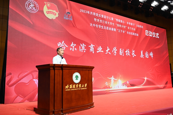 本次活動,在哈爾濱商業(yè)大學(xué)的大力支持下順利開展,哈爾濱商業(yè)大學(xué)副校長姜國鋒在儀式上致辭,他說:“學(xué)校建校71年來,立足立德樹人根本任務(wù),聚焦‘為黨育人,為國育才’的職責(zé)使命,在不斷加強(qiáng)‘第一課堂’建設(shè)的同時,還依托學(xué)校‘一體兩翼’文化育人模式,充分發(fā)揮實(shí)踐育人的作用,通過開展‘三下鄉(xiāng)’‘返家鄉(xiāng)’等社會實(shí)踐和‘西部計劃’‘興邊富民’志愿服務(wù)項目,引導(dǎo)廣大青年學(xué)生堅持用習(xí)近平新時代中國特色社會主義思想凝心鑄魂,在社會的課堂中‘受教育、長才干、作貢獻(xiàn)’?!被顒蝇F(xiàn)場,播放《黑龍江省希望工程30年與光同行》和黑龍江省大中專學(xué)生志愿者暑期“三下鄉(xiāng)”社會實(shí)踐活動宣傳片,與會領(lǐng)導(dǎo)上臺共同啟動了“情暖童心·鄉(xiāng)伴童行”公益項目、大學(xué)生“揚(yáng)帆計劃”實(shí)習(xí)活動、大中專學(xué)生志愿者暑期“三下鄉(xiāng)”社會實(shí)踐活動。
