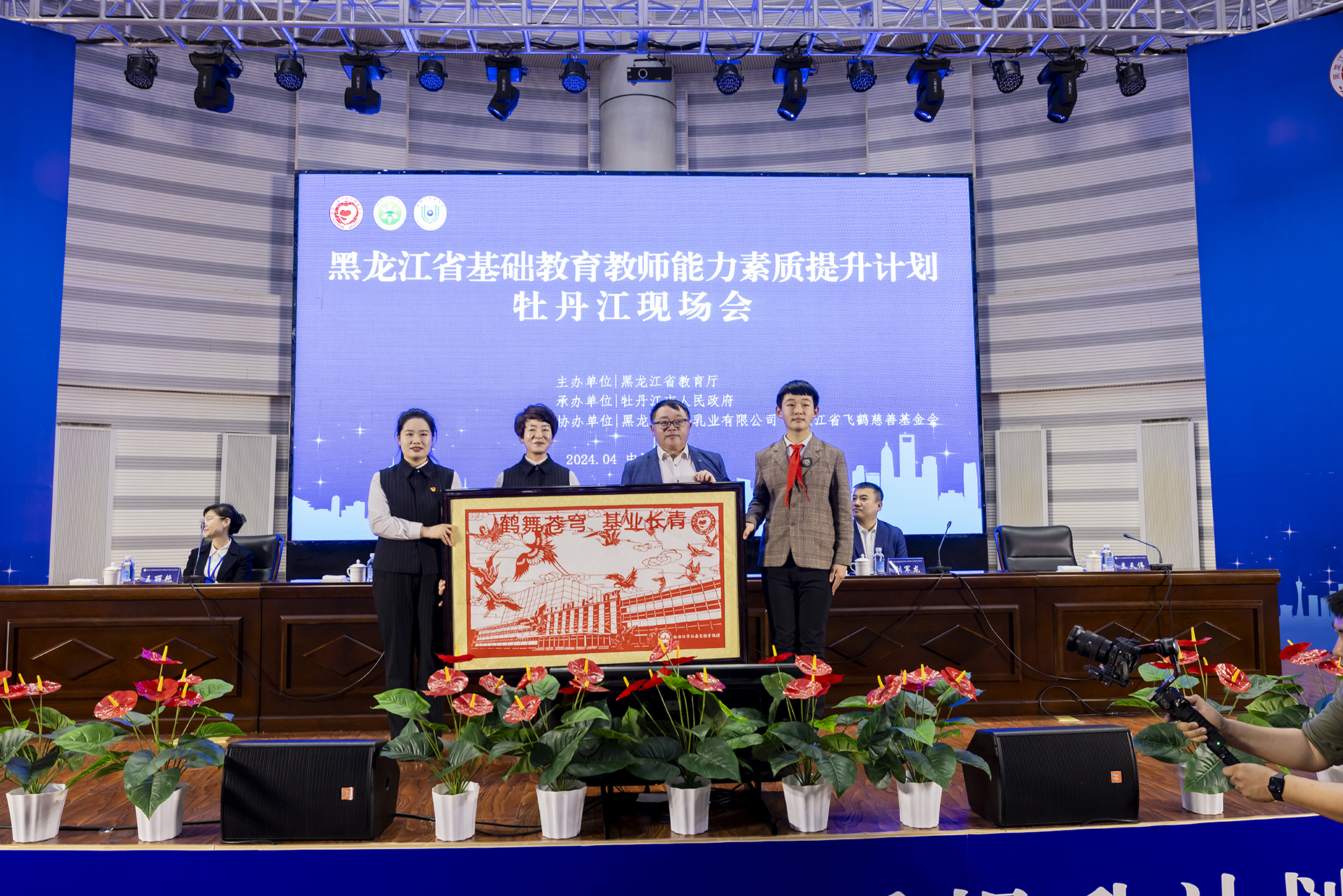 會(huì)議現(xiàn)場(chǎng),牡丹江市江南實(shí)驗(yàn)學(xué)校向中國(guó)飛鶴贈(zèng)送剪紙作品,以表示全省師生對(duì)中國(guó)飛鶴助力龍江教育公益行動(dòng)的感謝。