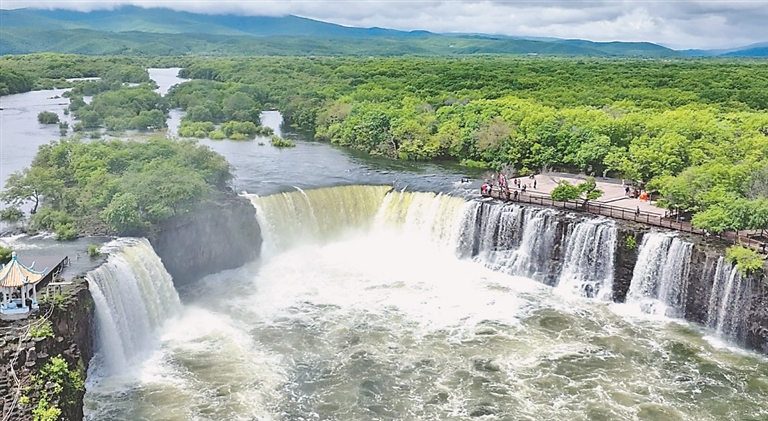 記者從景區(qū)管委會獲悉,由于連日降水,鏡泊湖吊水樓瀑布在今年首次出現(xiàn)三面飛瀑景觀,站在觀景長廊能看到三面環(huán)水的壯觀景象。近看瀑布水流一路狂奔,氣勢恢宏,無比震撼。