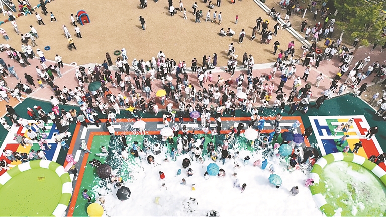 “彩虹泡泡派對(duì)”吸引眾多游客參與其中。本報(bào)記者 劉欣攝