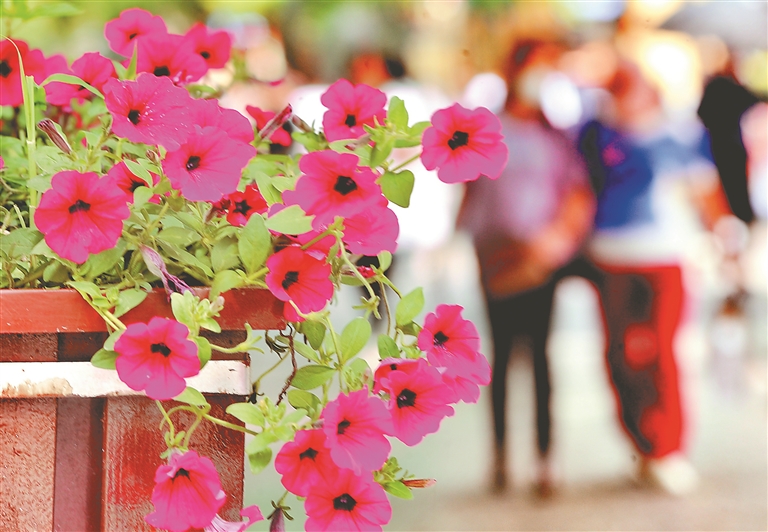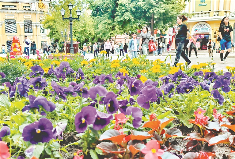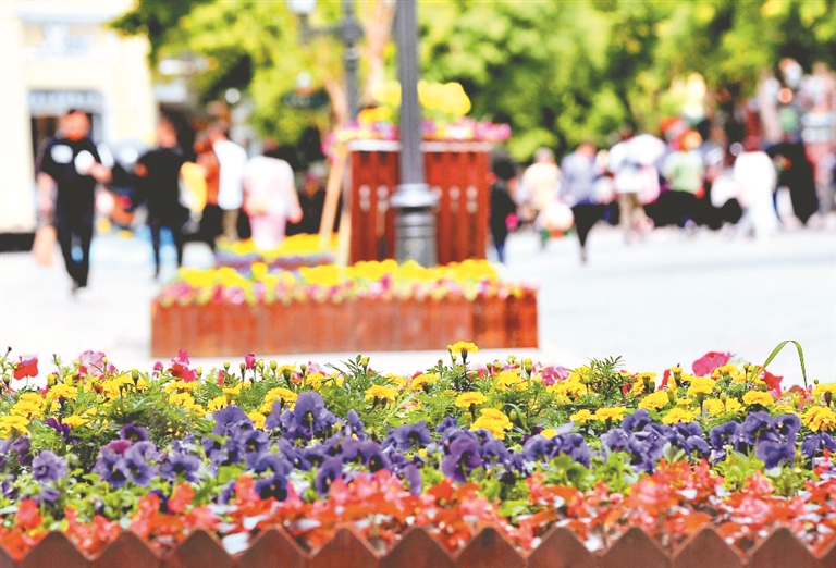 13日,哈爾濱市道里區(qū)中央大街上,行人從五彩繽紛的花卉旁走過。進(jìn)入夏季,來(lái)哈爾濱避暑游玩的游客不斷增多,為給游客打造一個(gè)舒適美麗的旅游環(huán)境,中央大街上種植了三色堇、金魚草、矮牽牛、四季海棠等多種花卉。這些鮮花姹紫嫣紅、爭(zhēng)奇斗艷,將整條街道裝點(diǎn)得十分靚麗。