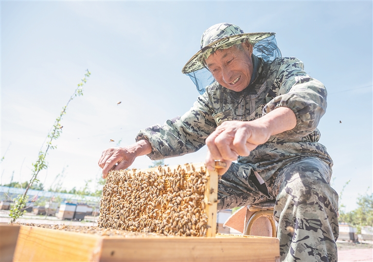盛夏,草木蔥蘢、百花盛開,正是蜜蜂采蜜的好時(shí)節(jié)。走進(jìn)齊齊哈爾市克東縣東興林場(chǎng),上百箱規(guī)格統(tǒng)一的木質(zhì)蜂箱整齊排列,蜂箱周圍,勤勞的蜜蜂們正忙碌地搬運(yùn)著甜蜜果實(shí),發(fā)出嗡嗡的聲響。