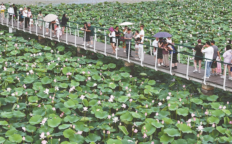 近日,哈爾濱文化中心濕地公園內(nèi)荷花綻放,吐露出它們的花苞,風(fēng)過荷塘帶來陣陣荷香,荷葉上的露水滴落,發(fā)出清脆的聲音,整個荷花池塘展現(xiàn)出夏天獨有的生機(jī)。這滿塘的荷花爭奇斗艷,吸引眾多游客、市民前來賞花打卡。數(shù)條觀光棧道延伸至濕地深處,人們走在棧道上,近距離觀看野鴨子、白骨頂雞等野生鳥類,與蘆葦、荷花等水生植物親密接觸。