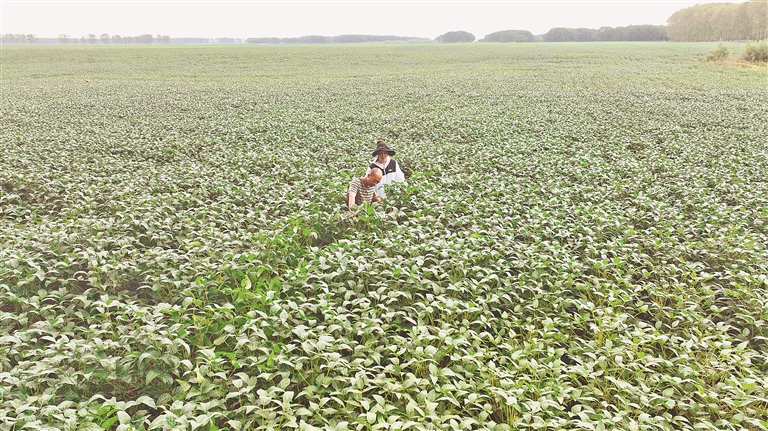 26日,在北大荒農業(yè)股份二九〇分公司一片大豆田中,種植戶戎立國正在查看作物長勢。表面望去,這片田地與普通大豆無異,這里實際種植的,是特色黑豆品種。