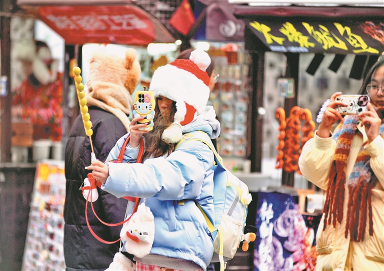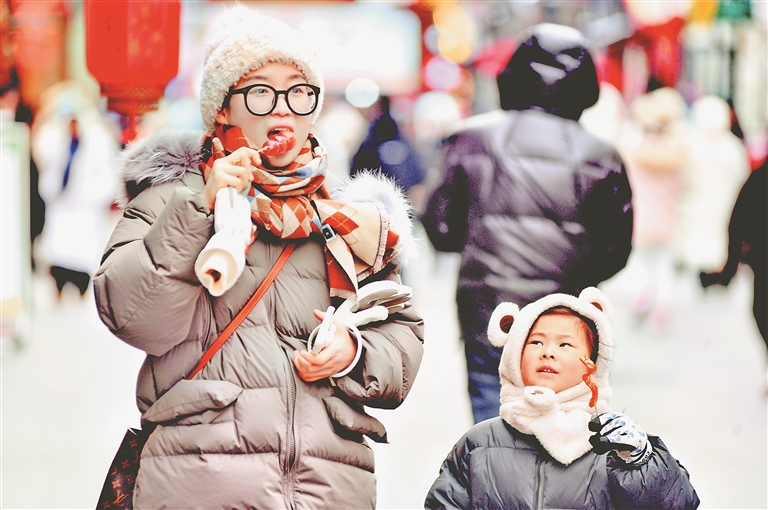 12月1日,哈爾濱市道外區(qū)南二道街附近,許多游客購買、品嘗美味的糖葫蘆。這些糖葫蘆有很多口味,包括山楂、葡萄、菠蘿、大棗、桔子、草莓等,有的還在里面添加了糯米、核桃等餡料。冬天,吃一串晶瑩剔透、甜里帶酸的糖葫蘆,絕對是一種享受。