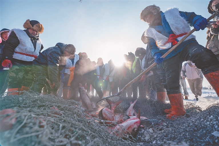 最具儀式感的冬捕祭祀儀式無(wú)疑是本次活動(dòng)的重頭戲之一。在魚(yú)把頭的帶領(lǐng)下,漁民們遵循古老傳統(tǒng),祈求庇佑、漁業(yè)豐收,隨著漁民收網(wǎng),網(wǎng)中的大魚(yú)逐漸顯露出湖面。