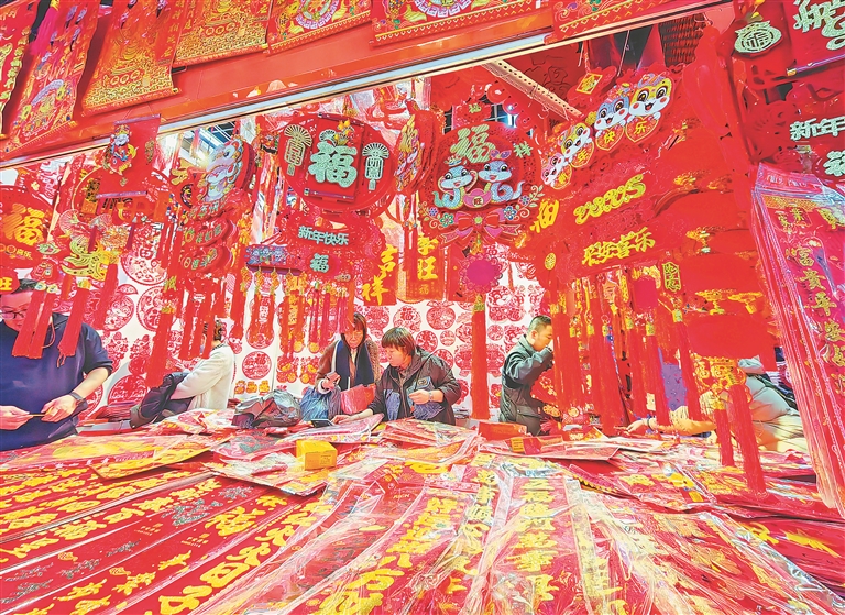 春節(jié)臨近,哈爾濱市道里區(qū)一處批發(fā)市場內,市民們正在購買各種節(jié)日飾品,用來裝點家居,迎接新春佳節(jié)的到來。蛇年主題的燈籠、對聯、福字等擺滿了柜臺,紅紅火火,喜慶氣氛濃厚。人們臉上都洋溢著幸福的笑容,一邊逛一邊買,個個滿載而歸。