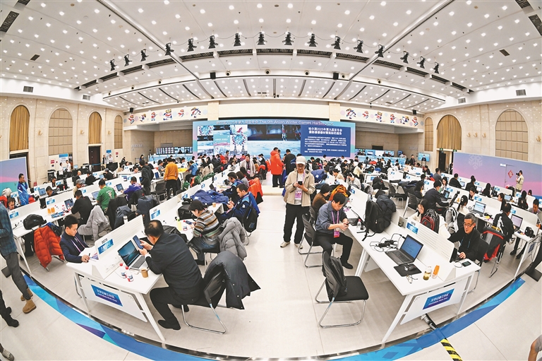 第九屆亞冬會主媒體中心(MPC)分為主新聞中心和國際廣播中心兩個部分,為注冊媒體記者和轉播商的工作提供保障服務。亞冬會開幕后,MPC里就坐滿了來哈爾濱采訪的各國記者,他們在這里寫稿,向各地發(fā)送有關亞冬會的最新信息和比賽結果,他們也在這里相互交流,成為異國朋友。