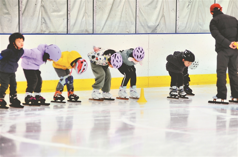 2日,哈爾濱市道里區(qū)冰上運動中心氣膜冰場內(nèi),百余名中小學(xué)生正在練習(xí)滑冰。