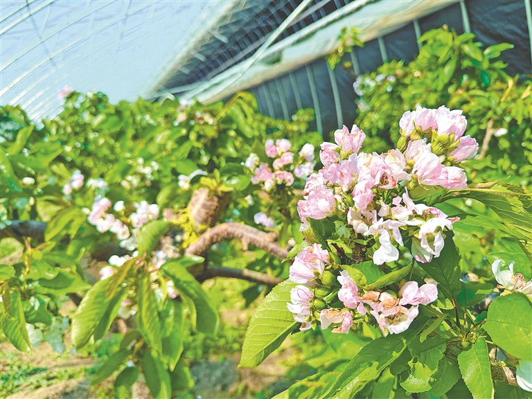 日前,湯原縣湯旺朝鮮族鄉(xiāng)大棚采摘園里櫻桃花大片盛開,吸引游客到此打卡拍照。據(jù)了解,該采摘園共有11棟大棚,種植1000余棵大櫻桃。櫻桃成熟后,果子個頭兒大,果肉厚實、硬度大,口感甜蜜,單體重量達到18克以上,年產量超7000斤,且耐儲存不易開裂,受到市場青睞。