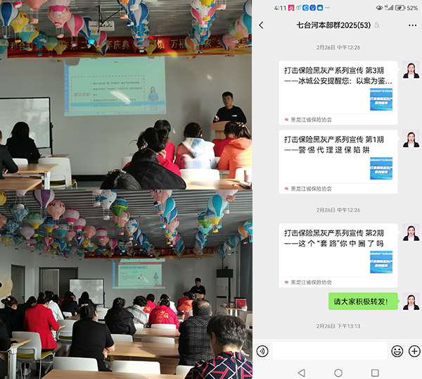 在此次打擊“代理退?!毙麄骰顒又?,七臺河中支利用微信工作群、微信朋友圈轉(zhuǎn)發(fā)宣傳內(nèi)容,詳細(xì)剖析了黑灰產(chǎn)的常見運(yùn)作模式,非法“代理退?!笨赡芙o消費(fèi)者帶來的四方面風(fēng)險:一是資金受損風(fēng)險;二是喪失正常保險保障的風(fēng)險;三是個人信息泄漏風(fēng)險;四是相關(guān)行為可能導(dǎo)致消費(fèi)者面臨訴訟等法律風(fēng)險。號召廣大群眾增強(qiáng)風(fēng)險防范意識,警惕非法“代理退保”套路。