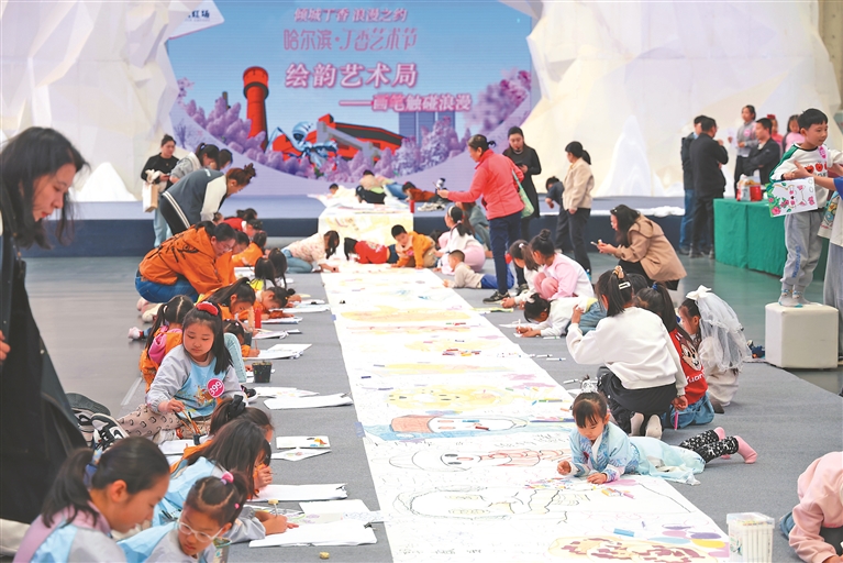 1日,“傾城丁香·浪漫之約”2025哈爾濱丁香藝術(shù)周在西城紅場(chǎng)美術(shù)館啟幕。圖為少兒丁香主題繪畫活動(dòng)。