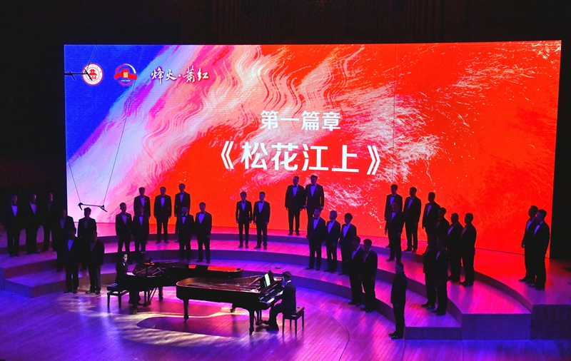 第一篇章《松花江上》以《長(zhǎng)城謠》的泣血鄉(xiāng)愁與《義勇軍進(jìn)行曲》的全場(chǎng)肅立高唱,訴盡抗戰(zhàn)時(shí)期的流亡之痛與民族豪情,更創(chuàng)新植入“童年、少女、青年”三代“蕭紅”扮演者(張舒涵、鄭楚琪、尤泓斐)與合唱團(tuán)的情景互動(dòng)。第二篇章《抗戰(zhàn)的烽火》中,《五月的鮮花》《露營(yíng)之歌》《保衛(wèi)黃河》等作品以合唱與立體站位,緬懷趙一曼、楊靖宇等英烈,再現(xiàn)全民抗戰(zhàn)的壯闊圖景。第三篇章《文脈永續(xù)》則通過(guò)魯迅、茅盾等文學(xué)名家對(duì)蕭紅的評(píng)價(jià)、跨年代讀者代表致敬及《致祖國(guó)》的磅礴合唱,彰顯其文學(xué)精神在新時(shí)代的傳承。