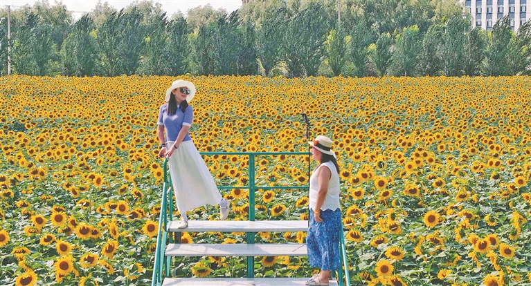 近日,哈爾濱市東方學(xué)院的校園里,30萬株向日葵進入盛花期,層層疊疊的金黃花瓣在校園里組成金色矩陣,連蜂蝶振翅都沾滿蜜糖色的光斑。風(fēng)掠過時,葉片翻卷出翡翠色的浪涌,花盤碰撞發(fā)出細雨般的窸窣聲,空氣里浮動著類似烤面包的溫暖香氣。花海間的小橋上,愛花的市民在這里打卡拍照,定格最美瞬間。