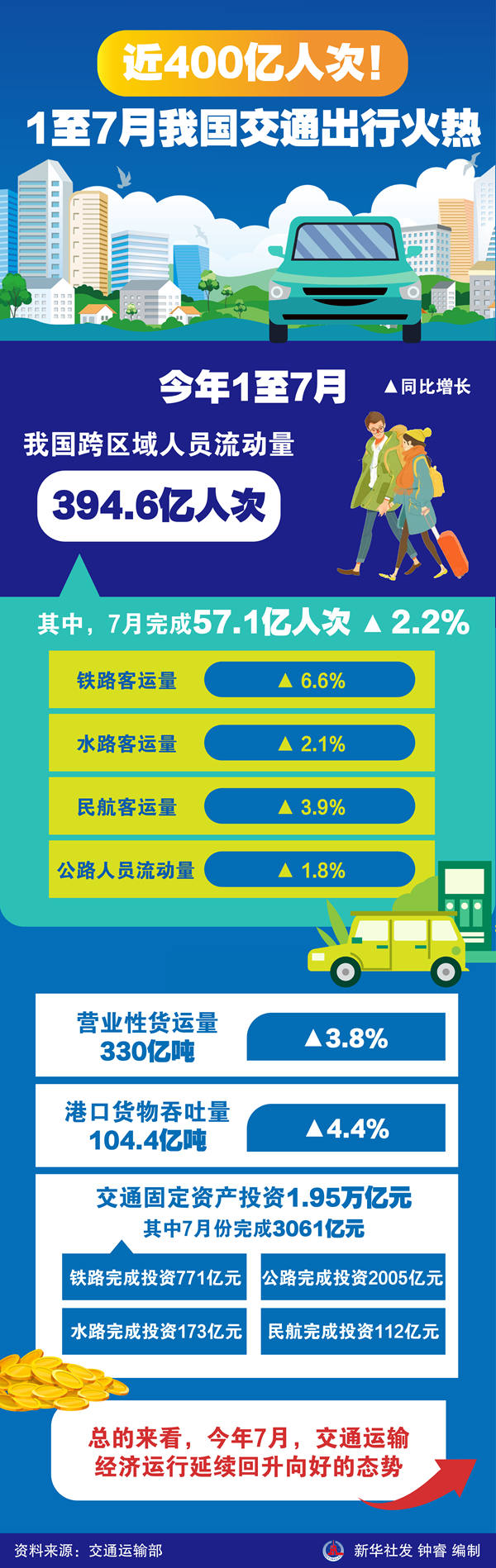“7月份,完成跨區(qū)域人員流動(dòng)量57.1億人次,同比增長2.2%,增速較上月回升0.7個(gè)百分點(diǎn)。分方式看,鐵路、水路、民航客運(yùn)量同比分別增長6.6%、2.1%和3.9%,公路人員流動(dòng)量同比增長1.8%?!苯煌ㄟ\(yùn)輸部新聞發(fā)言人李穎說。