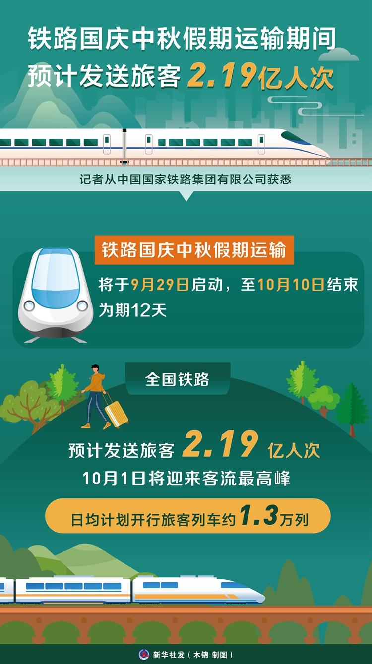 新華社北京9月28日電(記者樊曦)記者從中國(guó)國(guó)家鐵路集團(tuán)有限公司獲悉,鐵路國(guó)慶中秋假期運(yùn)輸將于9月29日啟動(dòng),至10月10日結(jié)束,為期12天,全國(guó)鐵路預(yù)計(jì)發(fā)送旅客2.19億人次,10月1日將迎來客流最高峰,日均計(jì)劃開行旅客列車約1.3萬列。